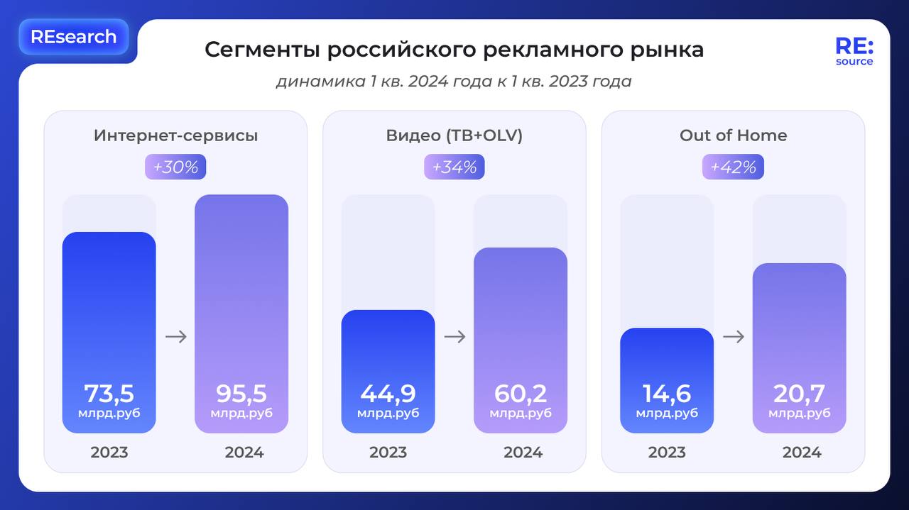 Комиссия экспертов Ассоциации Коммуникационных Агентств России подвела итоги развития российского рекламного рынка за I квартал 2024 года. Эксперты отметили продолжающееся динамичное развитие рынка – объем индустрии достиг уровня почти в 190 млрд руб., показав при этом очень высокую, рекордную динамику в +32%.