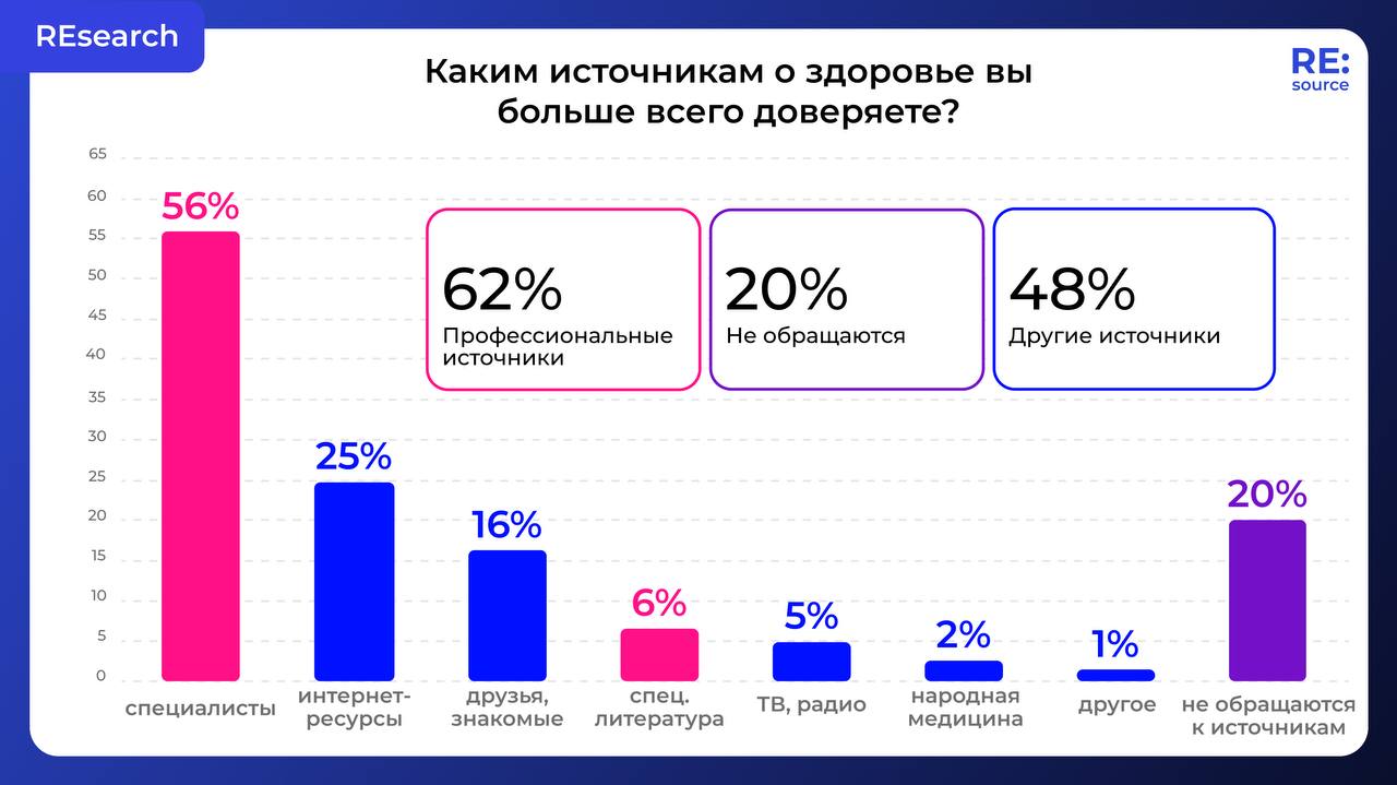 А ведь сколько раз говорилось — не надо гуглить симптомы. Впрочем, для большинства опрошенных профессиональные источники (специалисты, медицинские учреждения, инструкции, специальная литература) все еще остаются самыми авторитетными.