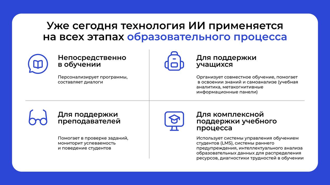 Будущее эдтеха действительно за ИИ. Применяться эта технология будет на всех этапах образовательного процесса, оптимизируя его для учащихся, преподавателей, кураторов и администраторов. Как именно — чекайте в визуализации.