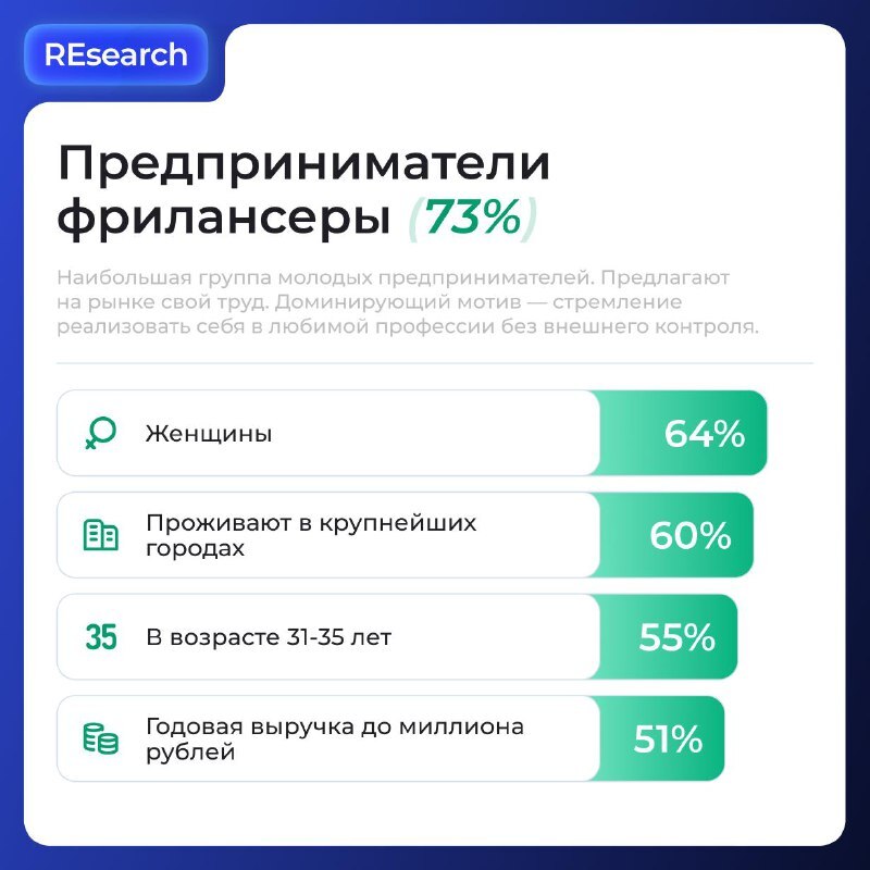 Среди молодых предпринимателей больше всего сегмент фрилансеров — 73%