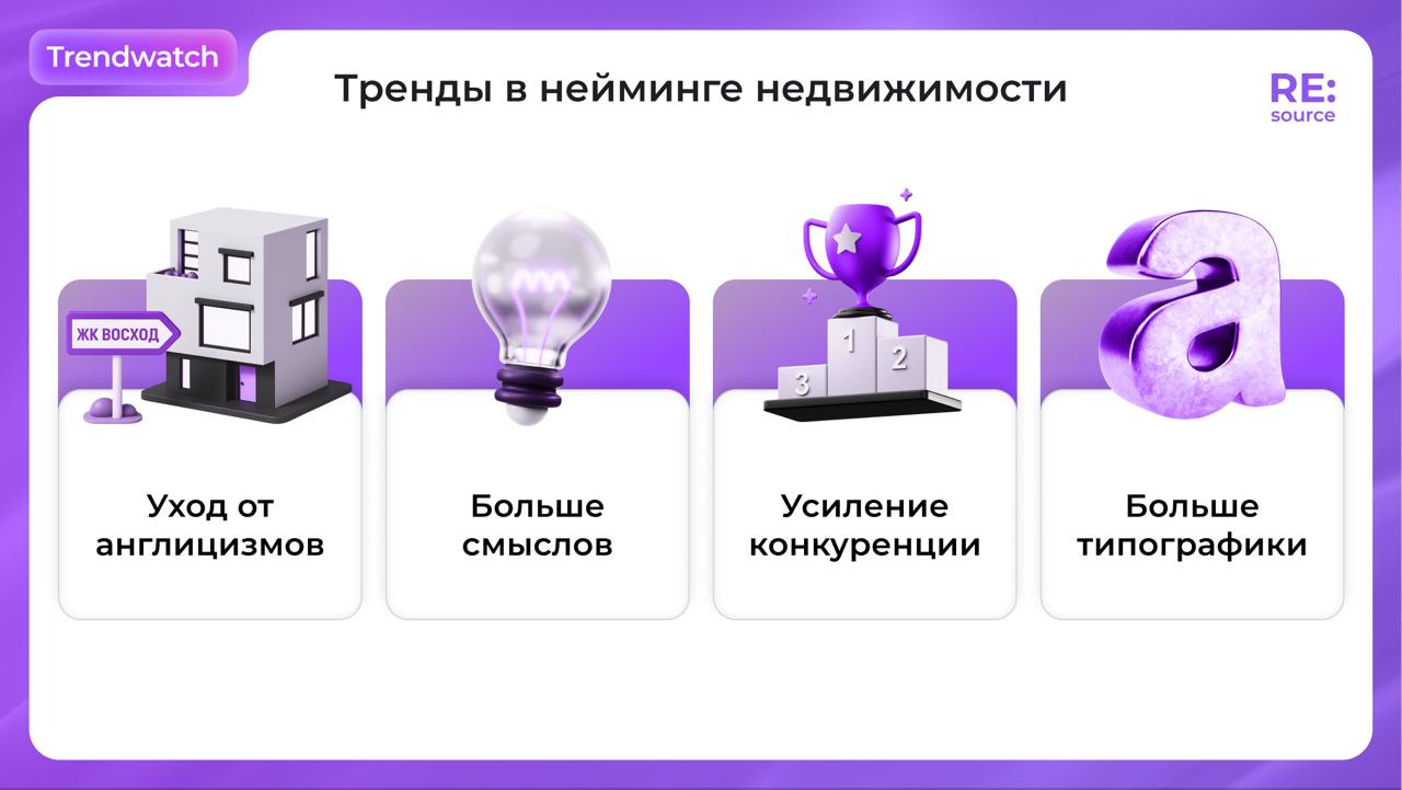 Экономико-политическая ситуация — один из главных драйверов этого тренда. В нынешних условиях девелоперы стараются подчеркнуть российскую идентичность своих проектов, используя родной язык. Многие считают, что использование русского языка в нейминге сделает названия более понятными для покупателей и усилит эмоциональный отклик. А с 1 марта 2026 года девелоперы будут обязаны называть свои объекты только на русском языке.