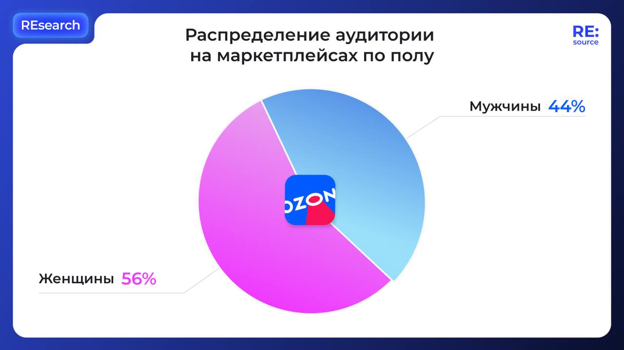 Оказалось, что на Ozon аудитория разделилась по полу практически поровну. А вот на Wildberries более двух третей пользователей — женщины. Что это значит? С товарами для мужчин лучше присмотреться к Ozon, хоть и женщин там все еще большинство. Из всех проанализированных в исследовании маркетплейсов мужчин больше, чем женщин, только на одном — на AliExpress.
