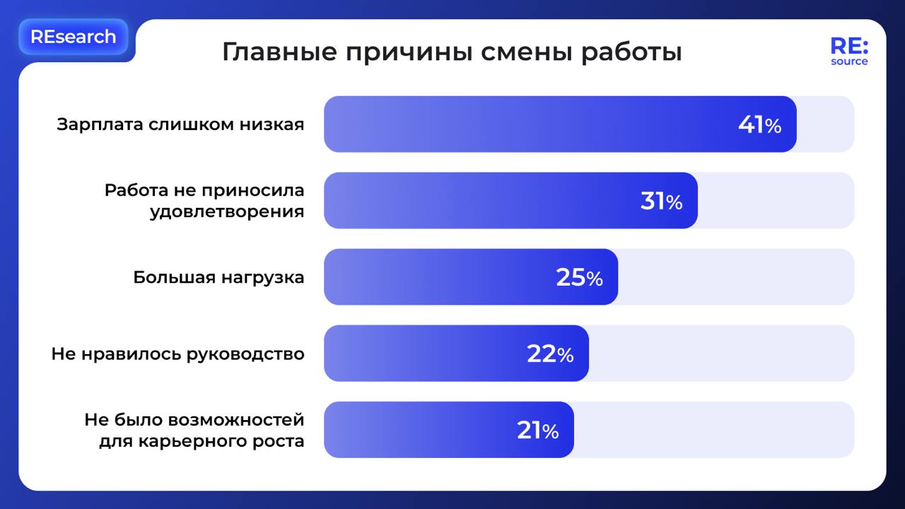 Финансовый аспект стал решающим — 41% респондентов назвали слишком низкую зарплату причиной своего увольнения. На втором месте по значимости — чувство неудовлетворенности. 31% отметили, что работа не приносила удовлетворения и именно это стало одной из причин ухода.