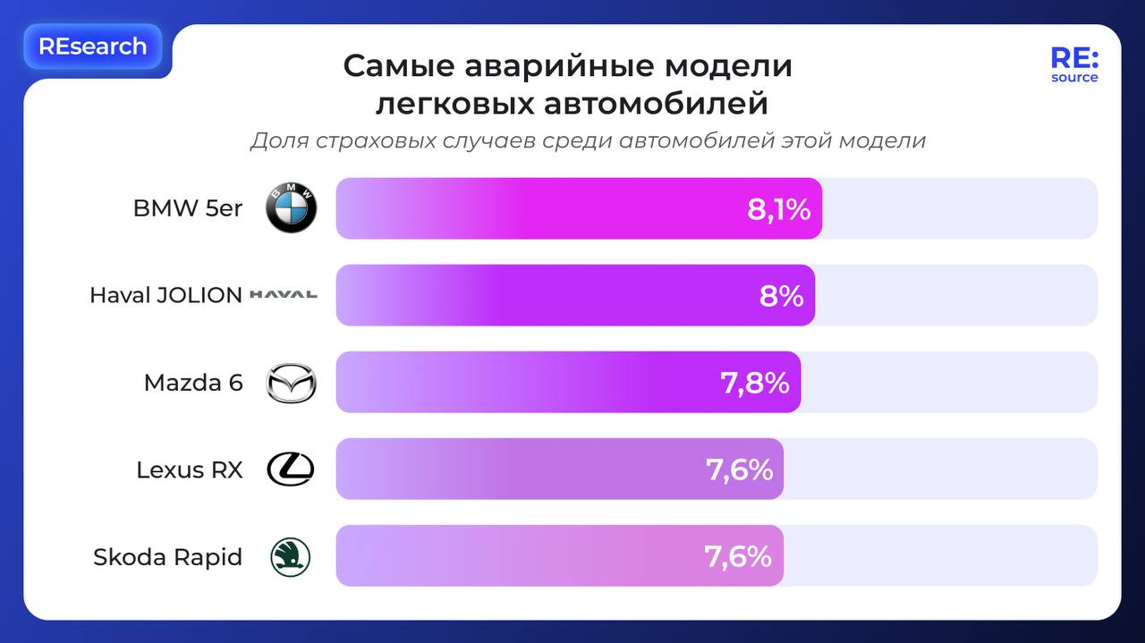 Вообще самая популярная модель авто в России — это Lada. Кстати, назвать ее аварийной моделью сложно, потому что в десятку рейтинга по проценту страховых случаев среди конкретной модели она не входит.