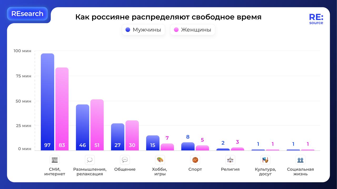По данным Росстата, российские мужчины в среднем имеют на 13 % больше свободного времени, чем женщины — около 4 ч 24 мин против 3 ч 53 мин в день.