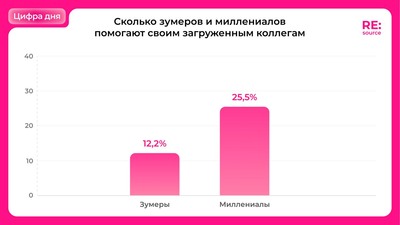 Gen Z в 2 раза реже предлагают помощь перегруженным коллегам, чем миллениалы (12% vs 25%) — психологи объясняют это установкой на границы и защиту от выгорания.