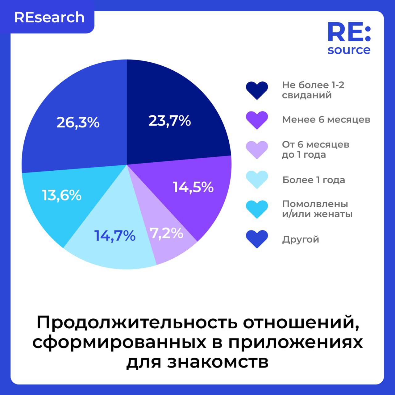 Степень «серьёзности» отношений каждый определяет для себя сам. А вот что говорит статистика: 23,7% респондентов сходили всего на 1-2 свидания, ещё 14,5% поддерживали общение до полугода. У остальных же получилось что-то большее. Совсем не плохо!