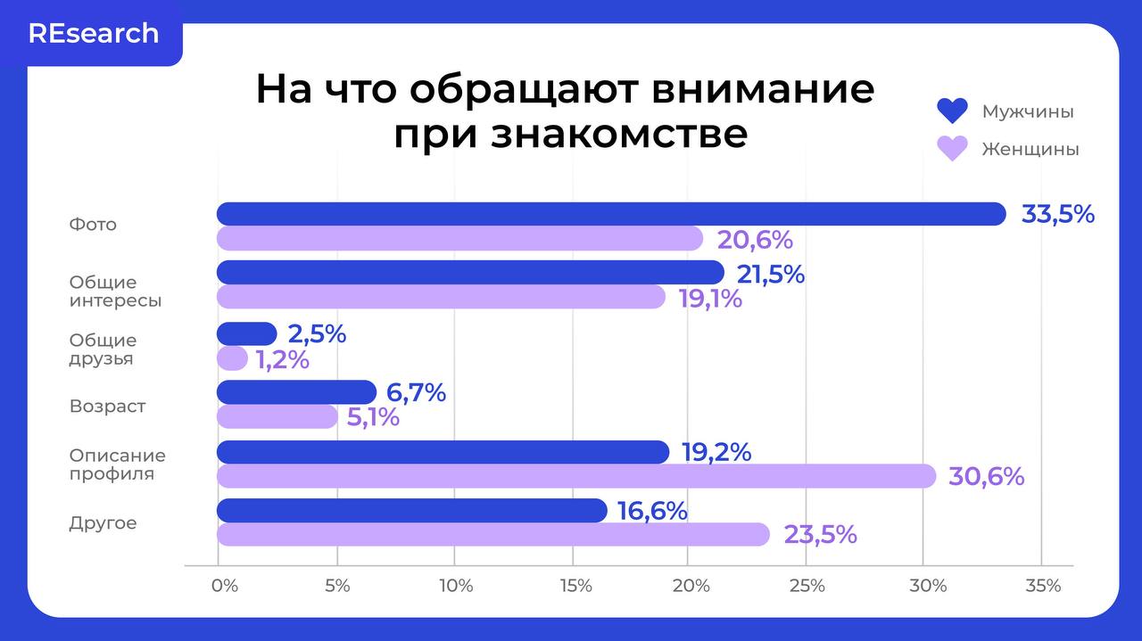 💙 В онлайн-знакомствах мужчинам важнее всего фотографии потенциальной партнёрши. Женщины чаще читают описание профиля. И, конечно, все обращают внимание на общие интересы.