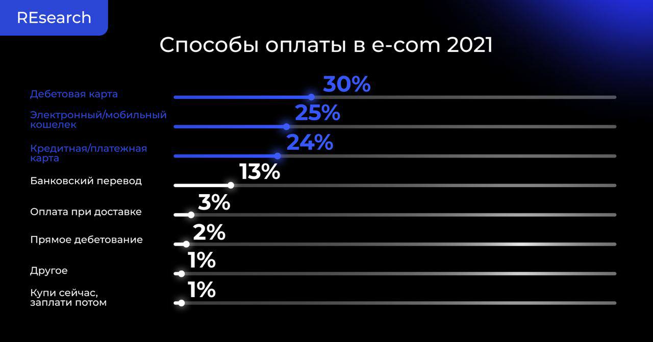 Топовые способы оплаты в онлайне — дебетовки (30%), электронные кошельки (25%) и кредитки (24%). Кстати, рисёрчеры предсказывают лидерство QIWI Wallet, VK Pay, WebMoney уже к следующему году. Наблюдаем!